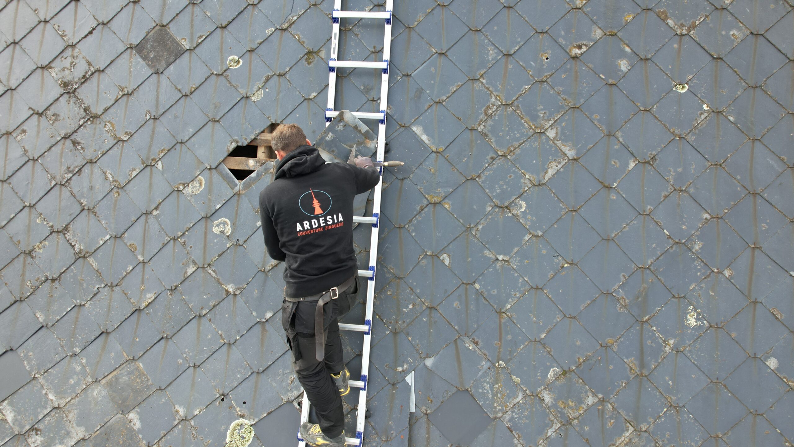 Chez ARDESIA Couverture Zinguerie, nous intervenons aussi bien sur des rénovations complètes de toiture que sur des petits travaux de zinguerie, comme ici, avec le