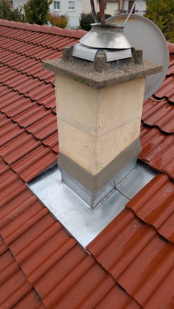 Nous avons donc réalisé un entourage de cheminée en zinc sur mesure, parfaitement adapté à la pente de la toiture et à la forme de la souche.