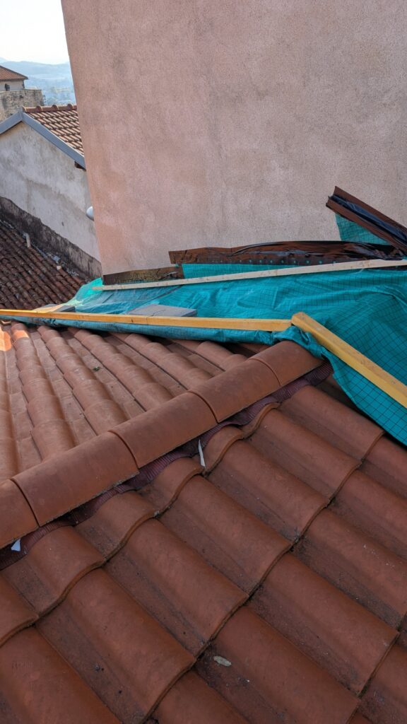 En attendant notre intervention complète de rénovation de toiture, nous avons mis en place un bâchage professionnel, parfaitement arrimé et étanche, pour protéger l’habitation des intempéries 🌧️