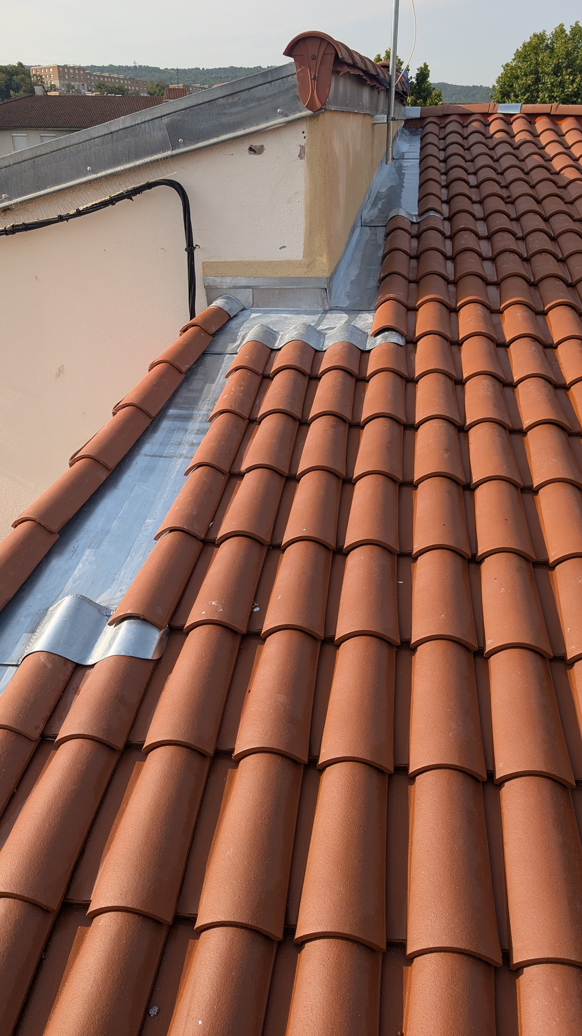 Dans le cadre de cette rénovation de toiture, nous sommes intervenus sur une couverture en tuiles Omega 13 rouges, avec la réalisation complète des raccords en zinc au droit du mur et des rives.