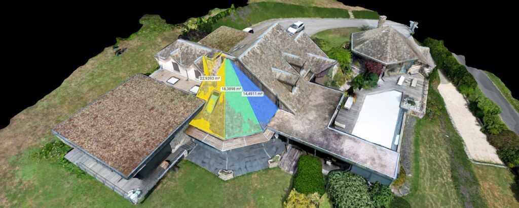 Notre méthode offre une précision largement supérieure aux estimations réalisées via Google Earth, souvent trop approximatives pour chiffrer des travaux. Grâce à la photogrammétrie et à des logiciels professionnels comme Pix4D, nous pouvons relever des surfaces au m² près, des linéaires exacts, des pentes, des rives, faîtages, noues et autres zones complexes.